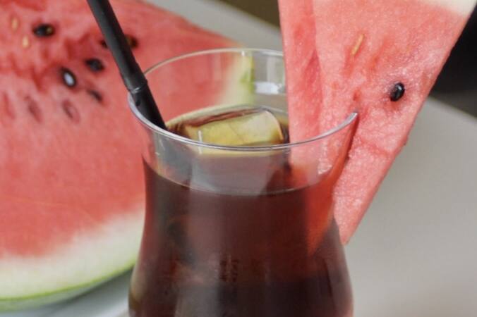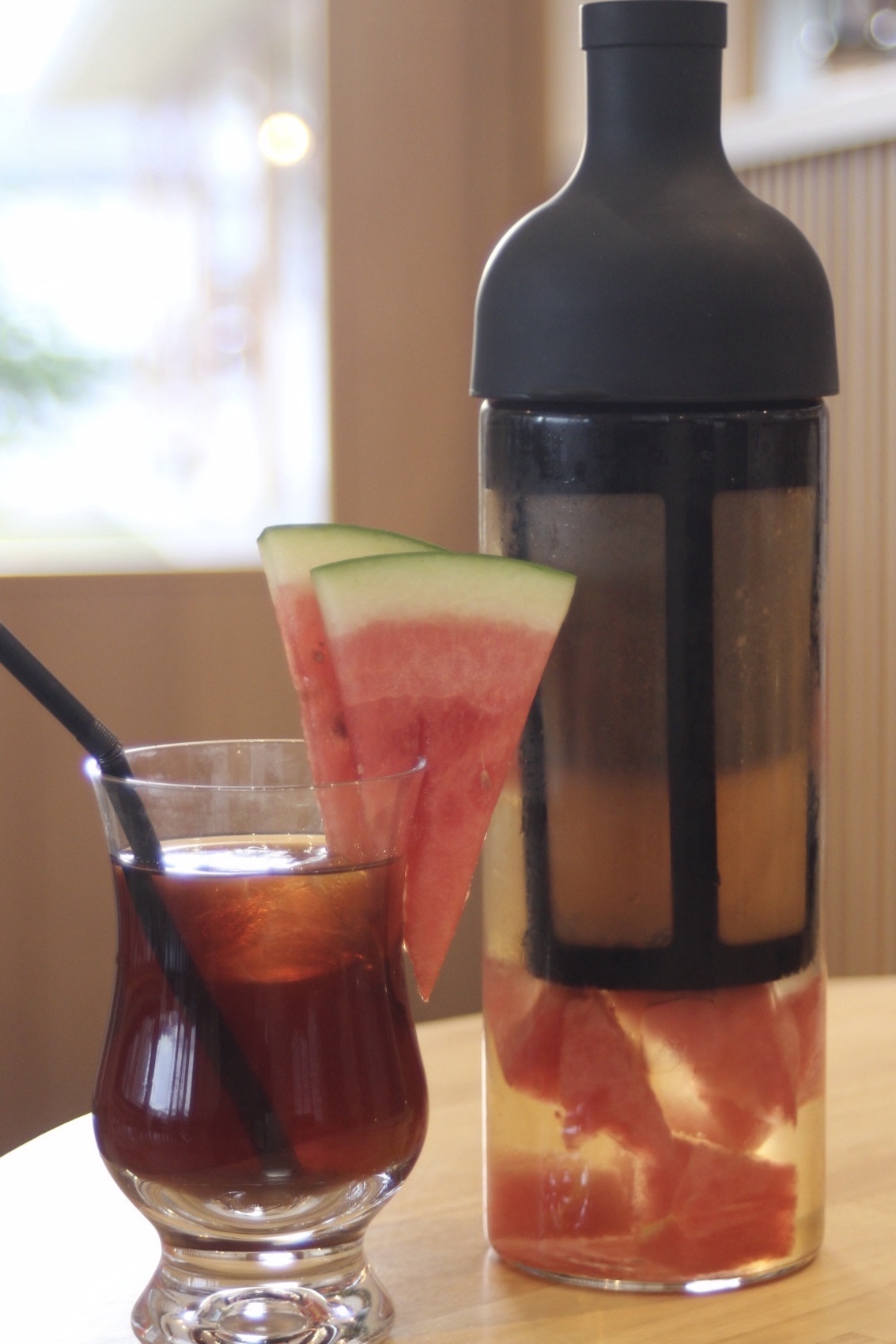 季節限定のお豆「ハワイマウイモカ」を挽いて、スイカの果肉と一緒に一晩じっっっくり抽出したオリジナルコーヒーです。