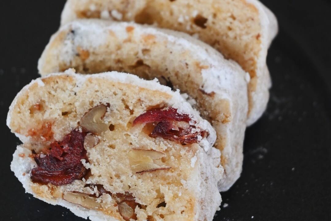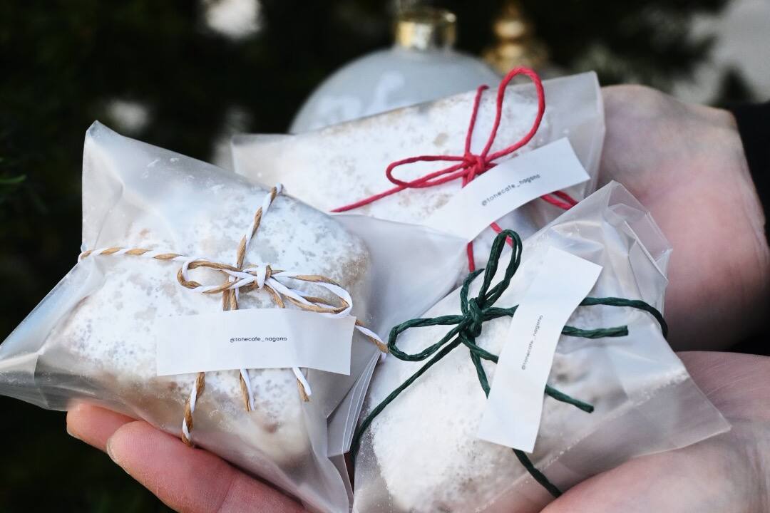 ベリーやナッツを練り込み、たっぷりの発酵バターにくぐらせ粉糖をまぶしています。