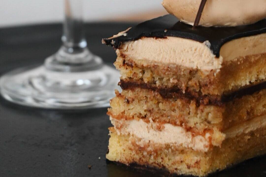 フランス伝統菓子ガトーオペラをtone cafeオリジナルの大人な味わいに。オレンジ果汁と果皮を練り込んで焼き上げたジョコンド生地に、香り高いエスプレッソシロップをたっぷりと染み込ませました。