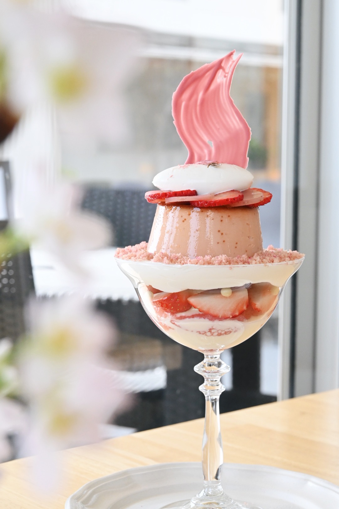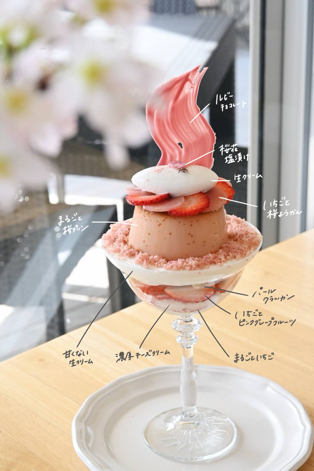 大きな桜プリンをまるごとのせて、いちごとグレープフルーツをたっぷり入れた春らしさ満点のパフェです。